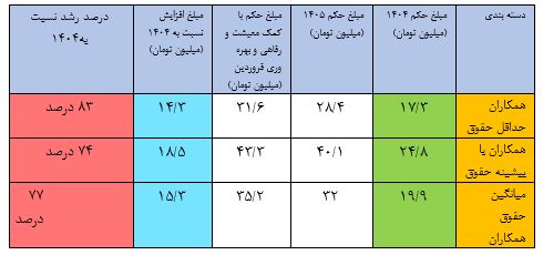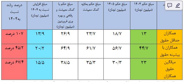 ب - همچنین باستناد لیست حقوق فروردین ماه ۱۴۰۵ همکاران محترم کارمند، میانگین دریافتی مبلغ ۴۱/۷ میلیون تومان و میانگین دریافتی در سال ۱۴۰۴ برابر ۲۶ میلیون تومان می باشد که دریافتی همکاران در سال جدید نسبت به سال گذشته ۶۰ درصد رشد نشان می دهد.