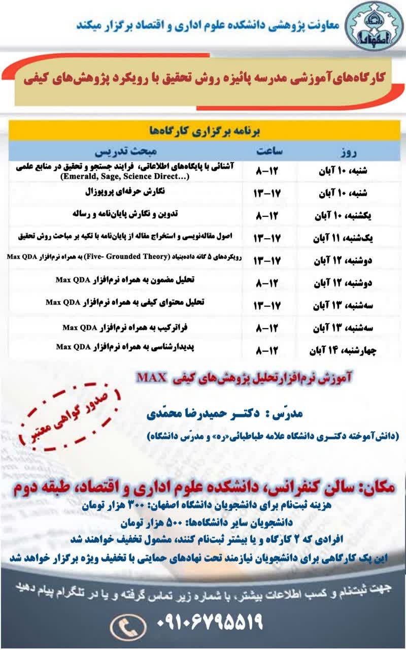دانشکده ی علوم اداری و اقتصاد درحال برنامه ریزی جهت برگزاری سری کارگاه های آموزشی با عنوان «مدرسه ی پائیزه ی روش تحقیق با رویکرد پژوهش های کیفی» از تاریخ شنبه تا چهارشنبه (10 تا 14 آبان ماه) به شرح زیر میباشد؛